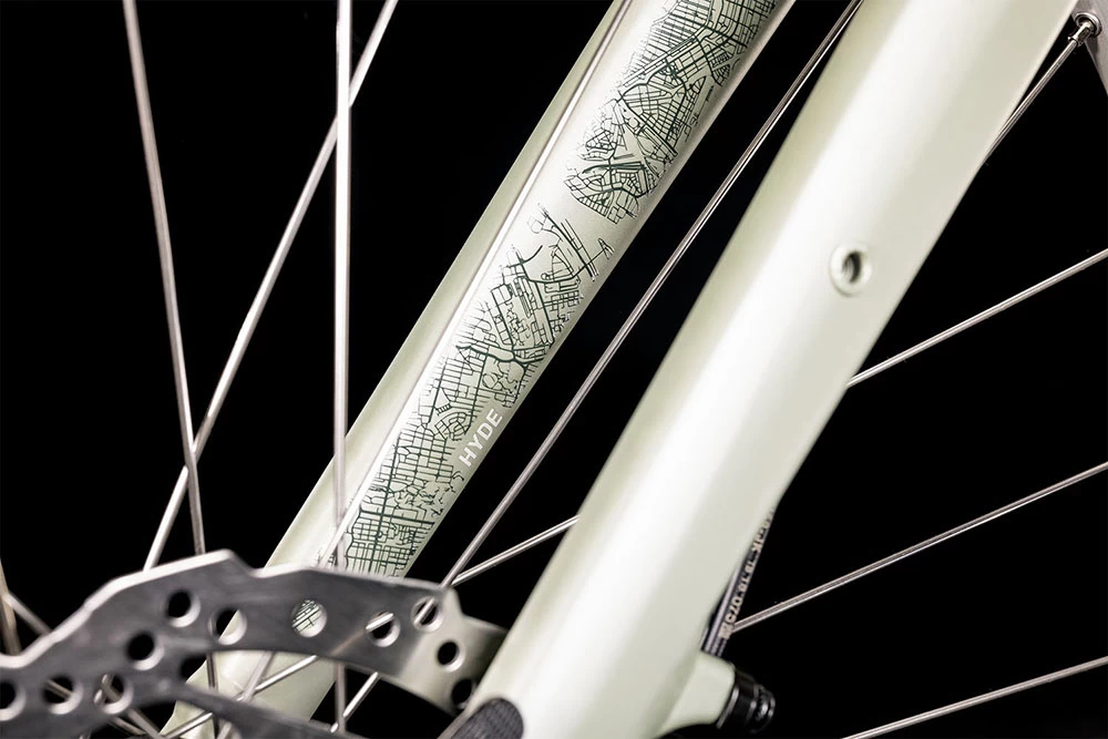 Die Fahrradkuriere der 80er und 90er waren nicht ohne Grund mit Mountainbikes in der City unterwegs, insofern haben wir uns bei der Entwicklung des Hyde auch an unseren 29er Hardtails orientiert. Doppelt konifizierte Aluminiumrohrsätze bilden eine stabile, haltbare, leichte und agile Rahmenstruktur, die dank nahtlos integrierter Montagepunkte die individuelle Nachrüstung mit Gepäckträger und Schutzblechen ermöglicht. Außerdem bietet sie genügend Platz für zwei Trinkflaschenhalter – vor allem auf längeren Touren ist man dadurch immer optimal mit Flüssigkeit versorgt. Schließlich komplettiert eine schlanke, steife Gabel den Rahmen, ihr Spezialgebiet: ein knackiges, präzises Lenkverhalten in Kombination mit wenig Gewicht und einem eleganten Look.