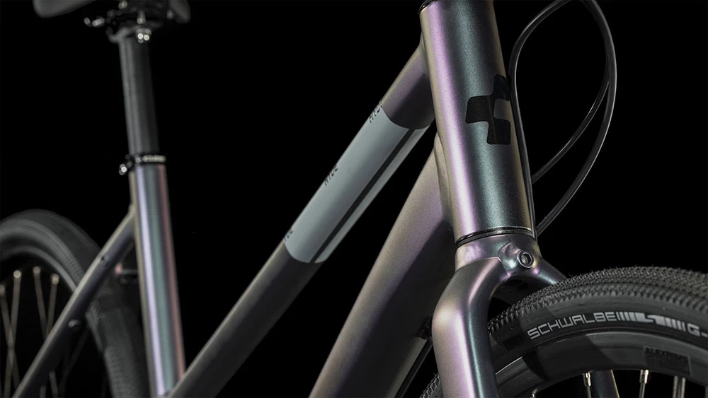 Die Fahrradkuriere der 80er und 90er waren nicht ohne Grund mit Mountainbikes in der City unterwegs, insofern hat CUBE sich bei der Entwicklung des Hyde auch an ihren 29er Hardtails orientiert. Doppelt konifizierte Aluminiumrohrsätze bilden eine stabile, haltbare, leichte und agile Rahmenstruktur, die dank nahtlos integrierter Montagepunkte die individuelle Nachrüstung mit Gepäckträger und Schutzblechen ermöglicht. Außerdem bietet sie genügend Platz für zwei Trinkflaschenhalter – vor allem auf längeren Touren ist man dadurch immer optimal mit Flüssigkeit versorgt. Schließlich komplettiert eine schlanke, steife Gabel den Rahmen, ihr Spezialgebiet: ein knackiges, präzises Lenkverhalten in Kombination mit wenig Gewicht und einem eleganten Look.
