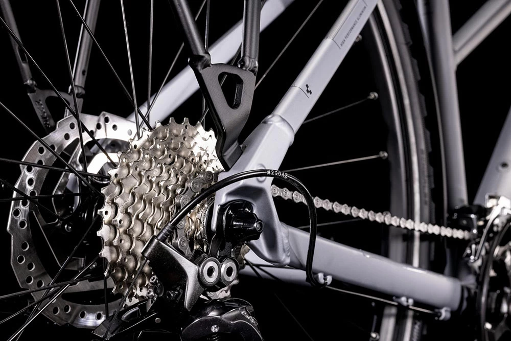Das Cube Nature EXC Allroad ist ein echtes Universalgenie und fühlt sich bei wochenendlichen Erkundungstouren abseits der gekennzeichneten Routen ebenso wohl wie auf den Straßen der Großstadt. Draußen in der Natur profitiert man vom Komfort der einfach einstellbaren Suntour Luftfedergabel, die sämtliche Schlaglöcher und Buckel auf der Strecke geschmeidig abdämpft.