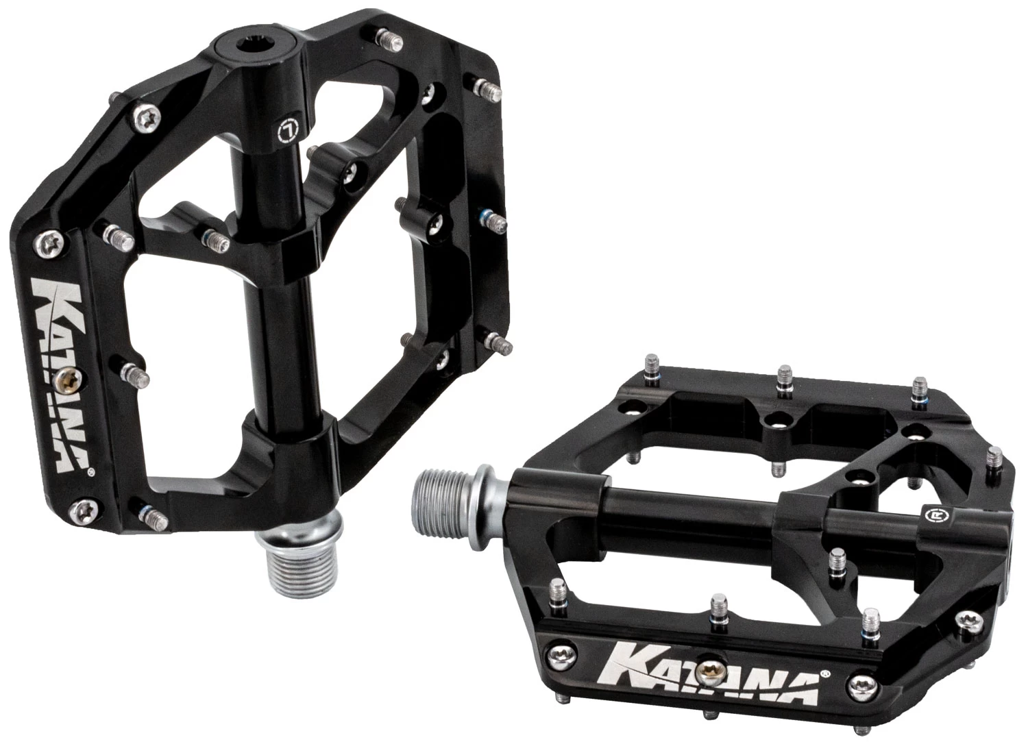 Die E-Blade Plattformpedale von Katana verfügen über einen leichten Aluminium-Korpus, eine durchgehende Pedalachse und extralange Pins für optimalen Grip. Dank der hochwertigen Industrielager und der soliden Bauweise sind diese flachen MTB-Pedale auf eine lange Lebensdauer und größtmögliche Vielseitigkeit ausgerichtet. So sind sie nicht nur für alle Situationen vom anspruchsvollen Trail bis zur täglichen Pendelstrecke geeignet, sondern machen sich auch am Trekkingrad oder E-Bike gut!