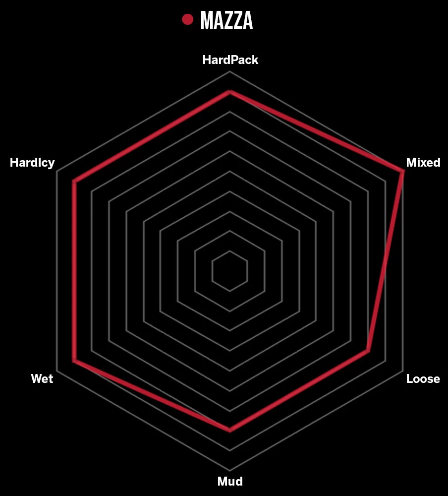 Ausgehend von einem ausgeprägten Mittelprofil verwendet der Mazza MTB-Reifen tiefe Lamellen in Laufrichtung, die es dem Reifen ermöglichen, schnell zu rollen und insbesondere im Gelände guten Grip zu bieten. Die abgestufte Vorderkante rollt ausgesprochen smooth, greift aber bei Steigungen tief in den Untergrund, was den Mazza zur exzellenten Wahl sowohl für den Einsatz am Vorderrad wie auch am Hinterrad des Mountainbikes macht. In der Laufflächenmitte wurde viel Platz gelassen, um eine gute Traktion zu gewährleisten und gleichzeitig die Reinigung zu erleichtern. Der Mazza ist mit den für Vittoria typischen ansteigend breiten Lamellen ausgestattet. Dieses einzigartige Lamellenmuster erzeugt einen asymmetrischen Laufflächen-Flex und führt zu einem berechenbaren, selbstsicheren und reaktiven Fahrgefühl. Die großzügige Profiltiefe des Mazza ist ideal zur Beherrschung diverser Untergründe, ein Effekt, der durch das von Vittoria entwickelte 4C-Compound-Layering gestützt wird. Vier separate Graphene 2.0-Mischungen wurden so geschichtet, dass die Oberfläche der Lauffläche eine gute Haftung bietet. Dadurch wird sichergestellt, dass selbst bei hoher Belastung alles an seinem Platz bleibt, ob in anspruchsvollen Kurven oder beim beherzten Bremsen.